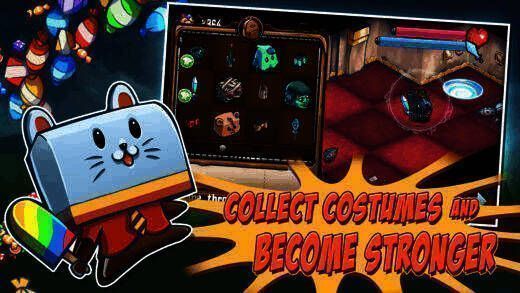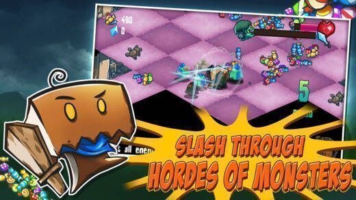 游戏中玩家要控制主人公一次性划过尽量多敌人,收集金币、道具、糖果升级角色属性,拾取宝箱换服装。