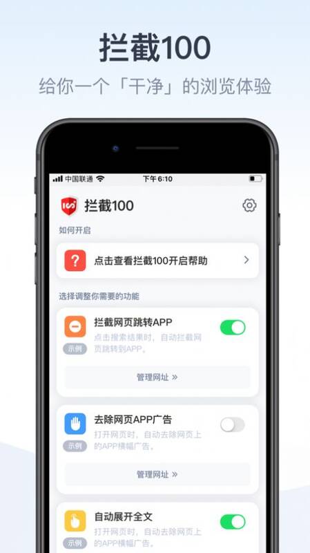 拦截100苹果版扩展完全基于ios15 / ipados15开发。它能拦截恶意应用程序在网页中的跳转,移除诱导广告,进一步保护用户浏览网页时的隐私,防止被广告跟踪。此外,对于网页隐藏长文本内容并恶意跳转到应用程序的行为,它会自动拦截并展开长文本,提升用户网页体验。