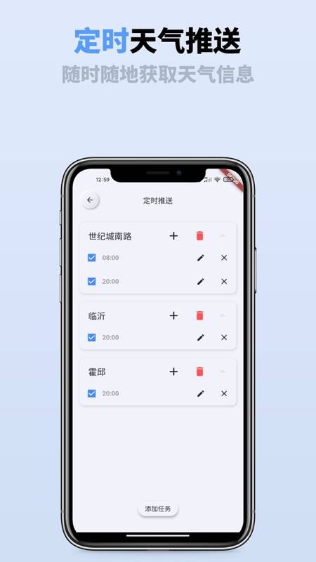 通过这个软件,你可以第一次了解天气和温度的变化,PM2.5的空气质量会随着时间的推移而变化,一旦有风吹草动,你可以立即查询。我们可以同时将多个不同的城市添加到您的手机中,这样您就可以在不切换的情况下立即了解相关的不同场景,您还可以添加需要在软件上完成的各种任务