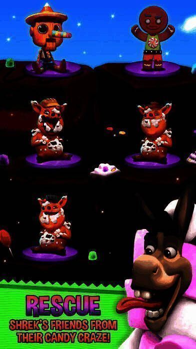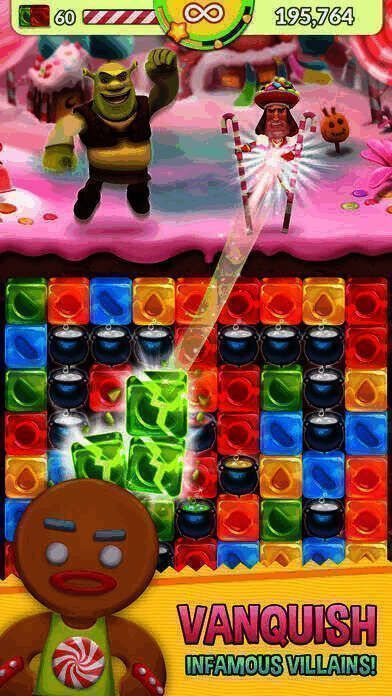 2、拯救你最喜爱的英雄:匹配多彩的瓷砖在上瘾的游戏!玩伴水平拯救Shrek的朋友们包括糖发烧驴,Gingy,Pinocchio,和三只小猪;