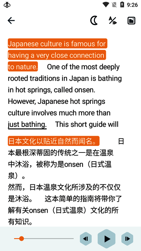 2. 有声读物阅读器:除实时翻译功能外,Beelinguapp内置有声读物阅读器。用户可选择感兴趣的故事收听,并跟随卡拉OK风格动画进行朗读练习。这种互动式学习方式,让学习者在享受故事的同时,提高发音准确性和流畅度。
