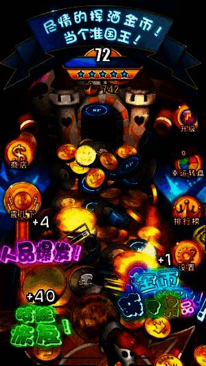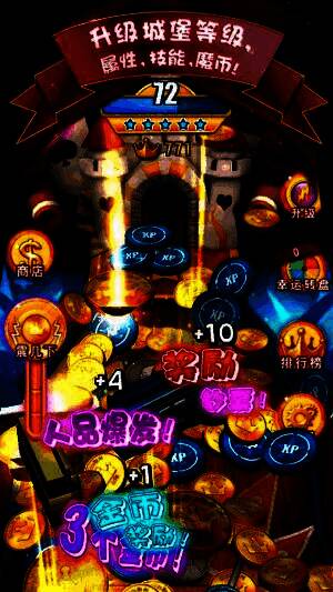 城堡推推推,将城堡内的金币推入你囊中,成为世界上最富有的国王!游戏中,你可以升级你的城堡、城堡技能和城堡的属性,都会让你越推越有劲!建造自己的城堡,收集大量的财富,把你的城堡建设成梦幻般的国度。游戏操作简单,只要把金币或者别的东西推到前面就可以得到,如果掉在两边就无法得到,和同类推币游戏不同的是前面断口处全部算出钱口,而不是只有很小的一点。