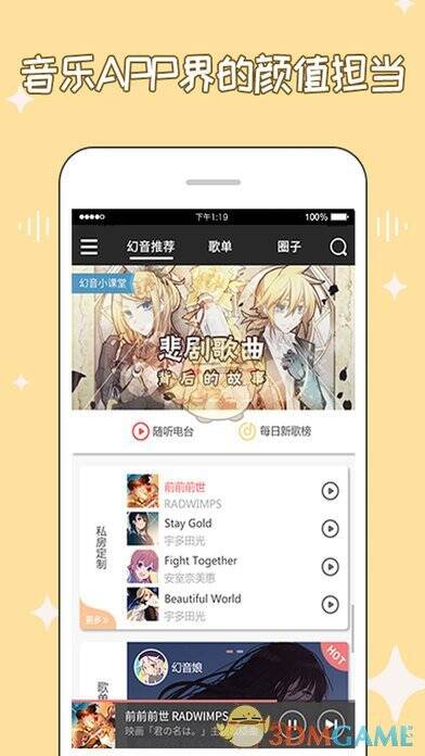 《幻音》,一款为二次元文化爱好者量身打造的软件,这里是二次元音乐的理想国度。你能在此欣赏到众多分类的歌曲,还可结交志同道合的朋友,一同热爱与传播二次元文化。