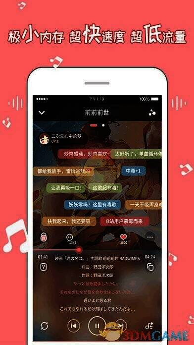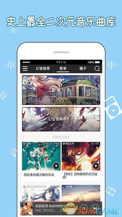 3D、动漫、中文、新番、游戏、纯音乐、燃曲、V家、鬼畜、人气唱见、东方、偶像、古风、摇滚、电子、和风、元气、同人翻唱等各类二次元音乐应有尽有!