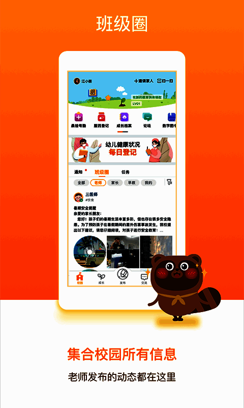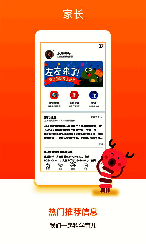 1. 首页校园:汇聚校园所有信息,老师发布的动态、任务集中于此。2. 平台热门推荐:成长徽章任务,携手科学育儿。3. 优化成长册:新增成长册自动同步、预览等功能,可切换模板打印。