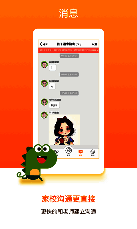 孩子通家长端专注幼儿教育,实现学习内容信息化,打造专属幼儿教育内容。教师与家长能通过 app 互动交流,详细掌握孩子信息。可保存孩子书写、绘画的文字和图片,实时沟通,陪伴孩子成长。还能制作与孩子玩耍的视频,记录生活细节。分校园版(供幼儿园教师)和家长版(供儿童家长),能记录孩子校内外成长每一步。