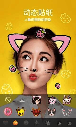 2、【动态贴纸】 猫须、腮红、兔耳朵等动态贴纸,人脸识别让贴纸自动贴到你脸上,瞬间萌态十足。