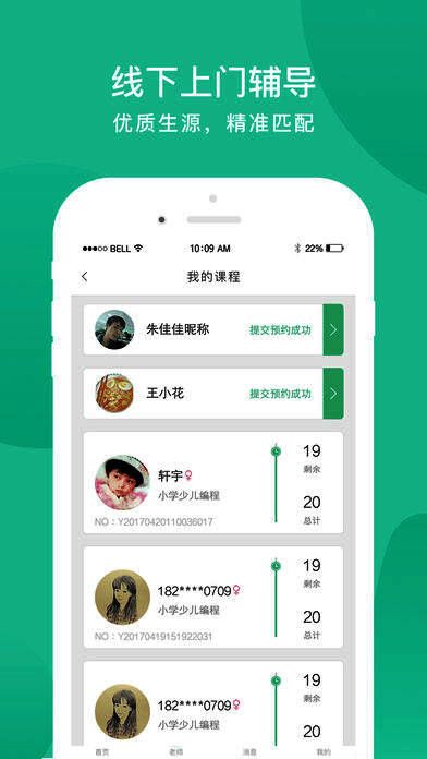 1. 找老师:选定[科目、年级、上课地址、日期、手机号、教师级别],就能预约上课老师。
