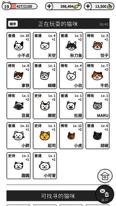 2、收集小鱼干和猫草,就会有新的猫咪出现;
