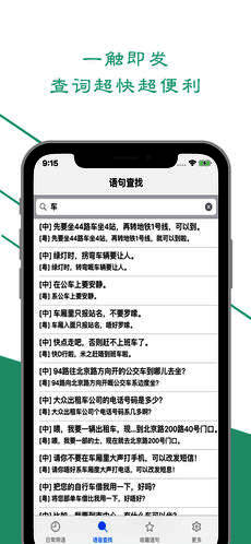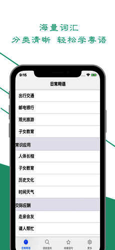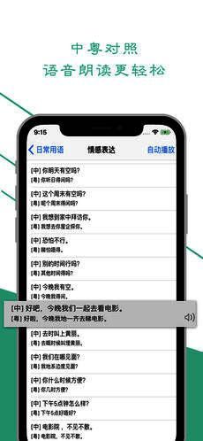 它采用真人发音,有中文粤语对照,包含日常用语、交际用语、常识应用等内容,还带有搜索功能,汉语对照清晰,粤语发音标准,学起来毫无难度。左滑标记语句可收藏,还能自动连续播放,让你畅听学习。