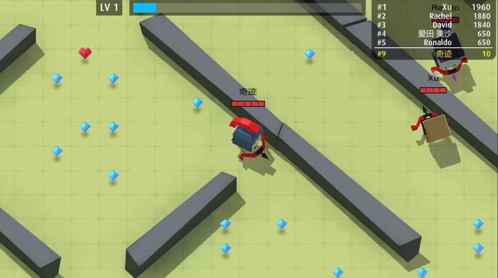 玩法上,《弓箭手大作战》以玩家间真实对抗为主,可随意击杀对手,每消灭一个敌人能获得积分和金币奖励。战斗场景中会不断出现钻石和红心,红心可补充血量,钻石能增加经验值、提升等级并获取新技能。游戏还提供多种角色供玩家选择,大多需用金币解锁,不同角色属性不同,能为玩家带来很大帮助。