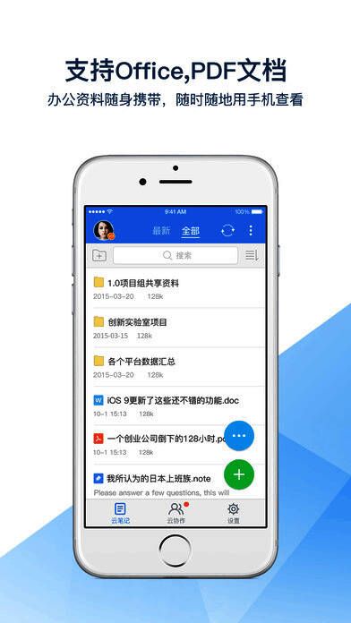 Word、Excel、PPT、PDF 等多种格式办公文档可在笔记内直接查看,无需下载;多级目录让海量文档管理井井有条;全局搜索支持搜索文档内容,更易定位目标笔记;文档可通过网页链接、易信、微信、QQ 等多种形式分享给朋友。