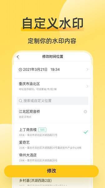 修改水印相机是一款集拍照、水印添加、视频录制与编辑等多种功能于一身的综合性应用。它拥有丰富多元的水印模板,用户能依照个人喜好和实际需求随意挑选,拍摄时即可实时添加水印,无需复杂的后期操作。无论是照片还是视频,都能轻松添加水印,让影像作品独具特色。此外,该相机时间定位精准,提供多种打卡专属水印模板,对标北京时间,位置准确,能轻松记录工作与生活中的点滴。在项目巡检、勘察取证、执勤执法、考勤打卡等场景中都能大显身手。