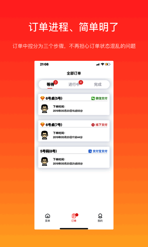1、订单有等待中、进行中、已完成三种状态,让你全面掌控订单情况。