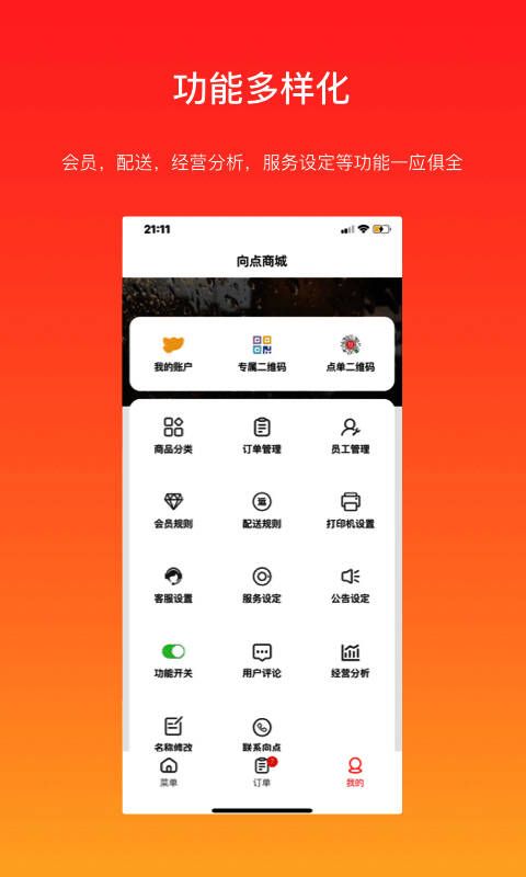 向点商家版(向点商家管理)专为商家打造,便于点单等管理操作。支持支付宝、微信、扫码点单,商家登录后可同时管理两个平台账户,方便快捷。