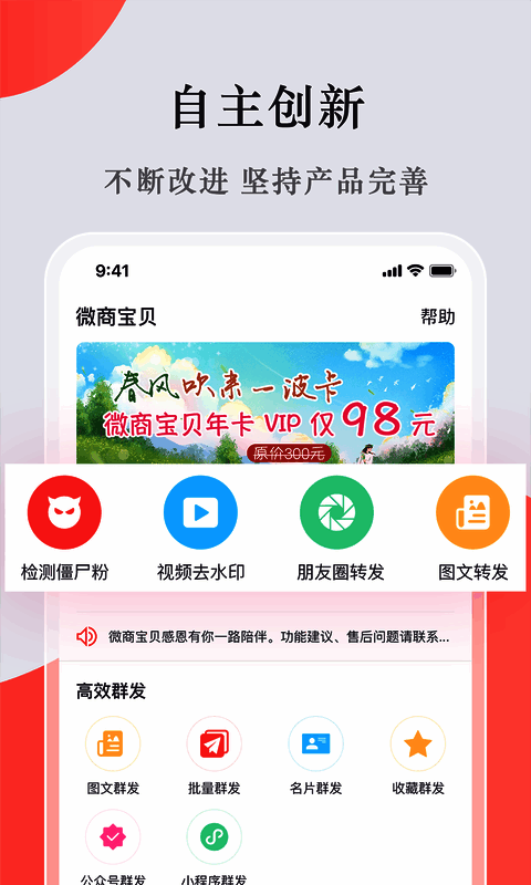 微商宝贝app是微商必备的工作工具软件,能有效助力微商用户将商品推广给更多有需求的好友,增加产品曝光,提高销售额。它基于安卓系统开发,在微信基础上为用户提供更便捷、快速的微信使用功能,还能为在阅读内容、触屏操作及声音控制等方面有困难的用户提供有效帮助,解决生活难题。该应用包含检测僵尸粉、视频去水印、转发等服务功能,操作简单,还支持分享给好友使用。