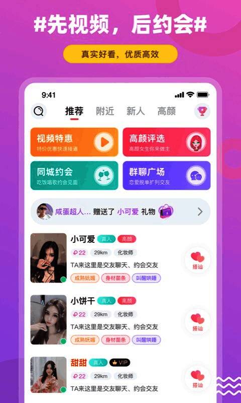 2. 视频聊天:用户能通过饭友与附近妹子视频聊天,增添情感亲密度与陪伴感。