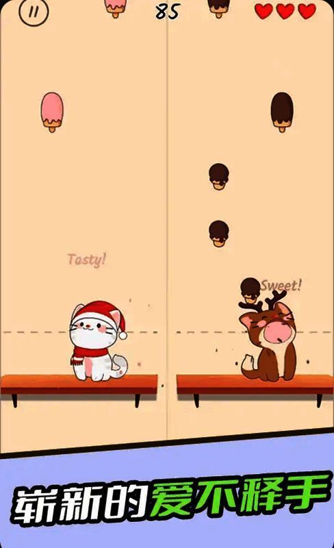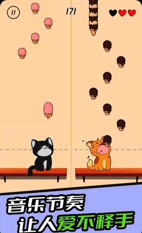 猫咪二重奏(Duet Cats Cute Music)游戏正版来袭,快来跟随萌趣小猫咪开启节奏挑战之旅!游戏难度恰到好处,画风软萌可爱,主打轻松休闲。关卡里,玩家分别操控左右猫咪接住美食,猫咪吃的佳肴越多,玩家积分越多,积分可兑换超可爱猫咪外观。