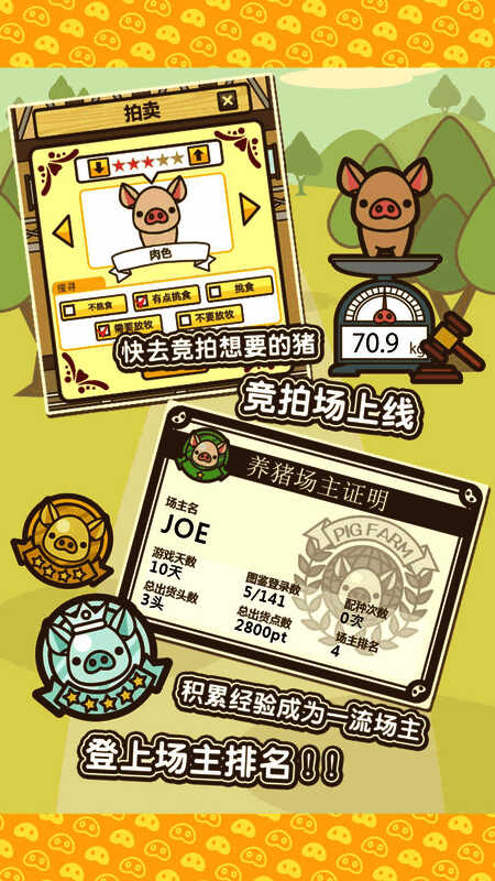 你拥有的小猪可以通过竞拍出售。你的小猪能卖多少钱呢?用心饲养猪猪,让它们长胖。不过,最终总会有分别的时候,可爱的猪猪最后要出货,这也是没办法的事,谁让它们是猪呢。