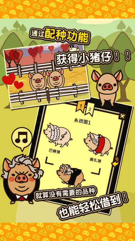 2、繁育各种小猪:利用配种功能,公猪和母猪配对可生出新品种。能轻松查看会生出什么小猪。多让养成的猪配种,还有几种猪只能通过配种获得。