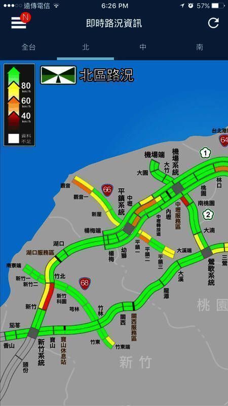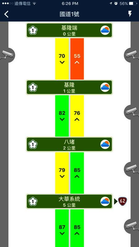 1. 堵车是开车时最头疼的事,有了高速公路1968,能立刻获取台湾各高速公路的当前路况信息,并用颜色表示路况。绿线代表路况平稳,红色或紫色表示交通拥塞。
