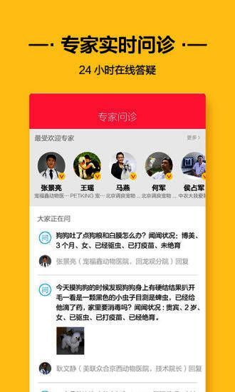 1、宠物专家在线问诊:百名宠物专家7×24小时提供在线咨询服务,宠物医疗、训练、营养、造型等问题都能解决。