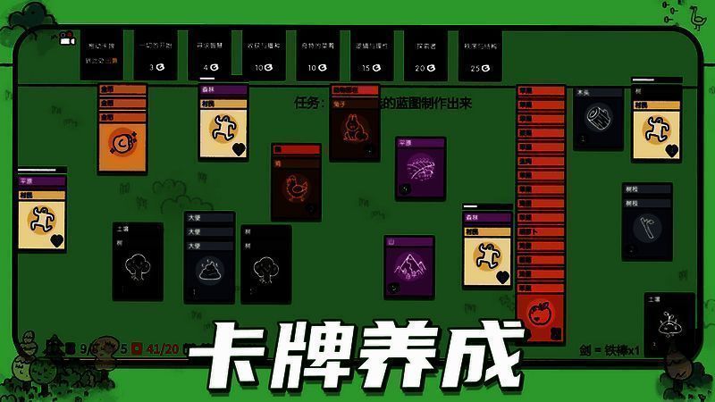 以纸牌形式探索生存世界,代替各种物品和道具;玩家可购买纸袋随机获得物品,像动物、食物、怪物、石头等;通过不同牌堆合成不同道具,击败最终boss。