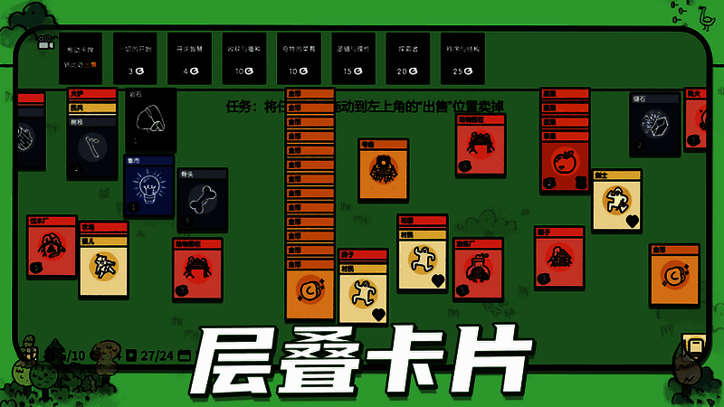 把实物卡拖到市场能出售资源换“金币”卡,也可用金币卡买其他物品;将不同资源与“村民”牌放在一起会触发其他效果;游戏中有100多张牌待收集,其中25多张是“创意”牌。