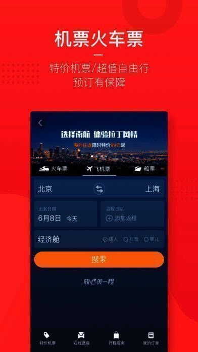2、机票:拥有海量优质低价国内外机票,可随时随地一键预定。每日推荐低价机票,不错过任何低价机会。还可实现在线选座、航班动态、机场交通、机场电话一键查询。