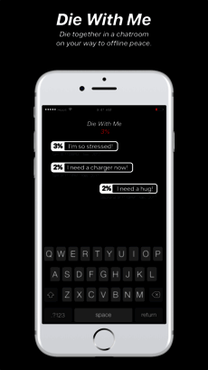 “Die With Me”意即“和我一起死”,此 app 专为手机电量即将耗尽时使用。当电量降至 5%,它会为用户提供一个聊天室。开发者表示,他们想在手机快没电时做点积极的事,看到人们在没电时仍开心聊天,觉得为大家创造了乐趣。