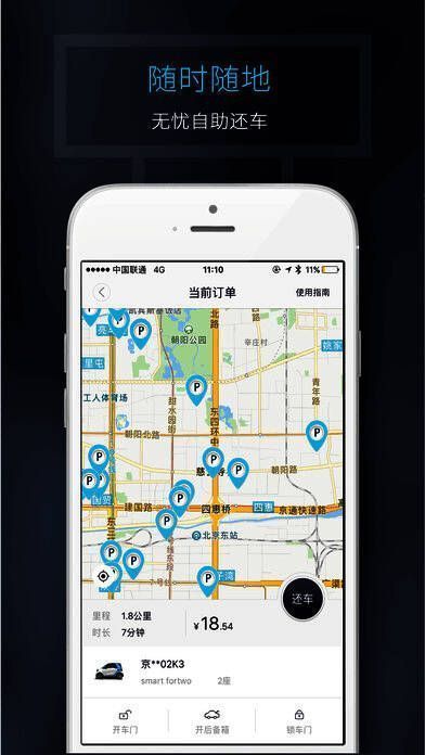 4. 可随时自助还车,使用灵活,无规定租车时间,时间由用户掌控,还能随时自助寻车。