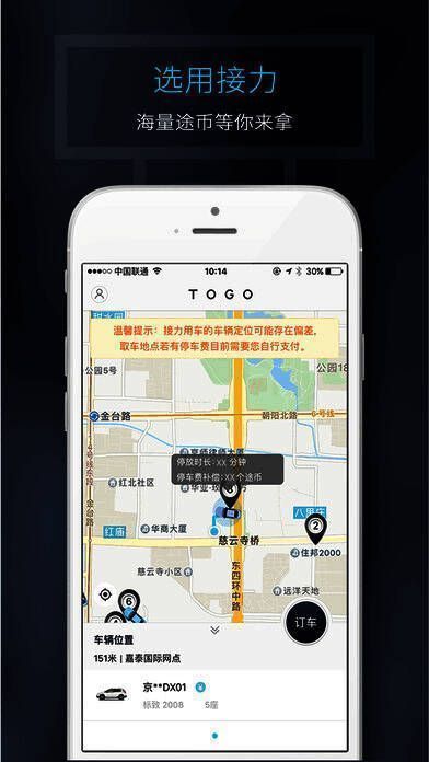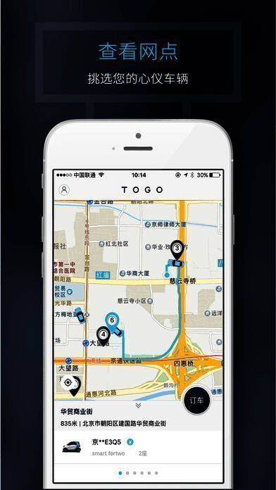 继摩拜单车后,智能租汽车兴起,TOGO途歌出行就是一款“智能租赁车”,可理解为汽车版摩拜单车。它与传统租车公司大不相同,无需交有去无回的注册费,也不用办繁琐手续,且车辆多为奔驰Smart Fortwo最新款。使用时,打开APP注册,寻找附近可租车辆,定位预约,选择最近网点一键开约,APP会提示车辆限号情况。选好车后,通过手机智能开门即可开走。它颜值高、车内灯有型,还有定制版车型。用完车后,无需开回原租赁指定点,在合法停车点用银行卡、支付宝、微信均可付费,且停车免费。此外,还有全新五座SUV——东风雪铁龙C3,两款车型能满足不同人群需求。TOGO注册费为0,起步价白天1.88元/公里,7:00 - 20:00是0.02元/分钟,20:00 - 7:00是0.28元/分钟,比打车等都便宜。每辆车都有保险,事故由保险公司处理。目前,在北京国贸、三里屯等潮流地标均有网点。