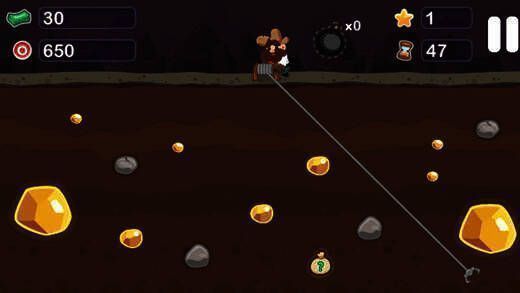 1、操作简单,钩子摇摆时,瞄准金子,点击屏幕就会放出钩子抓取。