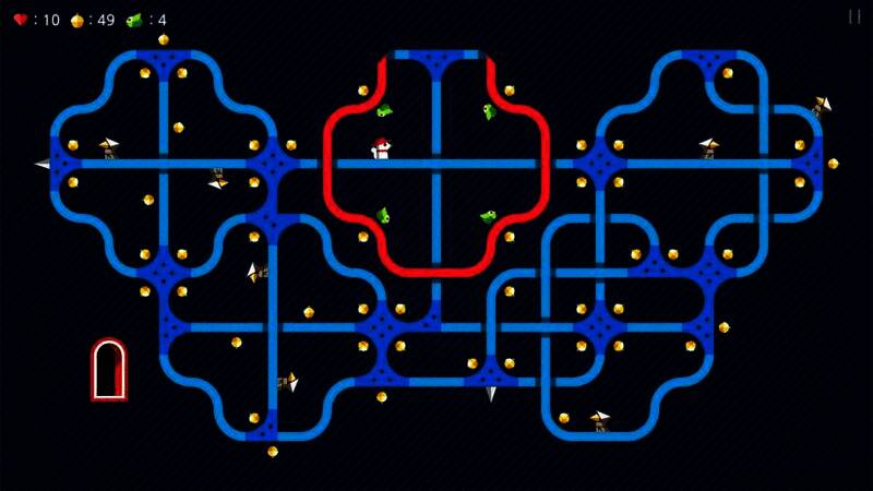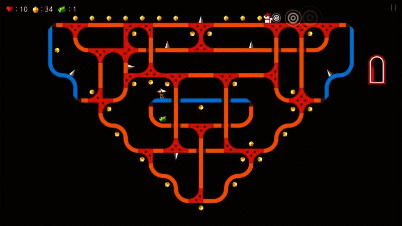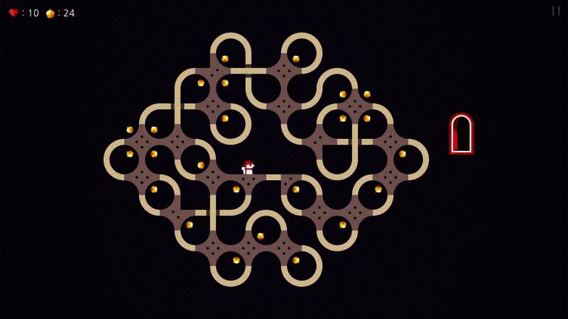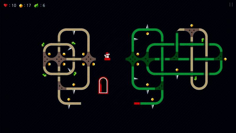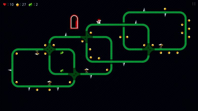 在游戏里,玩家要扮演戴红帽的松鼠多特里奥。这只小松鼠无意间闯入了机关密布的迷宫,玩家得引导它找到出口。一路上会遇到很多尖刺和僧侣,玩家只能在松鼠前进到拐角处时,通过滑动来改变它的行进方向,从而让它走上正轨。