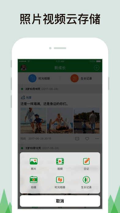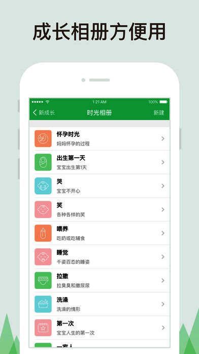 4、时光相册:轻松管理孩子成长各阶段的照片,不错过任何一个精彩瞬间,涵盖怀孕时光、出生第1天、第一次、一家人、笑、哭、搞怪卖萌、满月、100天、1周岁、2周岁等;