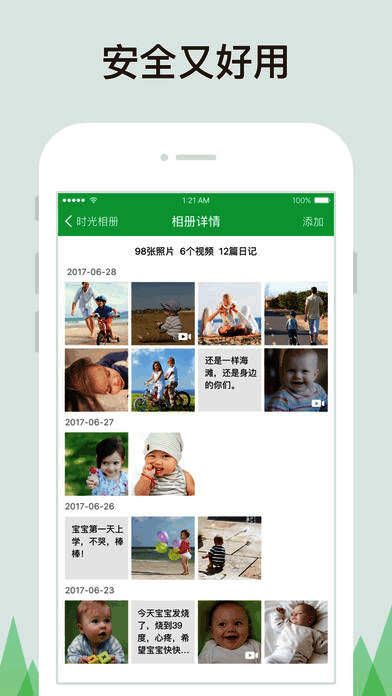 3、具备超受欢迎的宝宝相册和育儿日记功能,私密程度高、存储空间大、数据安全有保障,并且永久免费使用。