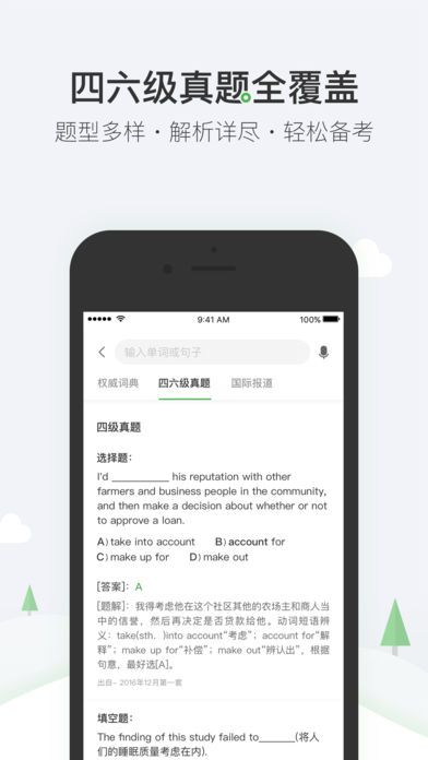 4. 四六级真题:覆盖99年至今所有四六级真题,有题解和释义,轻松备考。