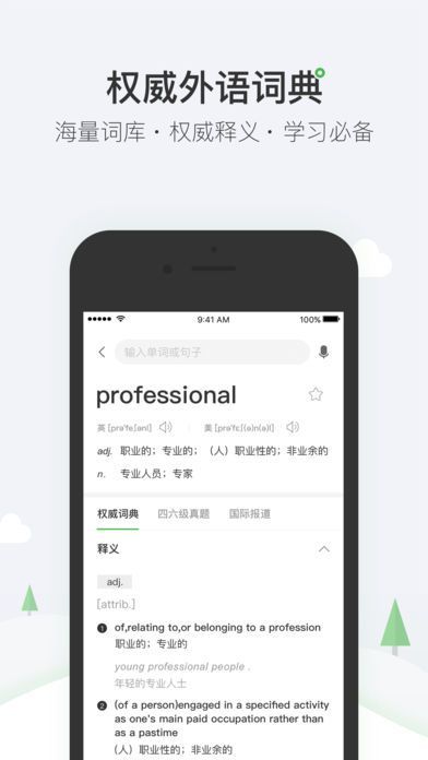 与权威词典合作,为用户提供权威、专业的词汇释义,还融入了四六级真题、国际新闻资讯等实用内容,助力用户在不同场景下掌握英文词句的含义和用法,让你原汁原味学英语。