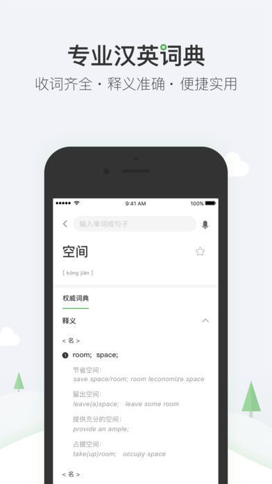 1. 海量词汇:内置海量词库,有英汉双语权威释义,提供读音、词形变化等多方面信息,多个同形异义词也会详细注明释义,语料真实地道。