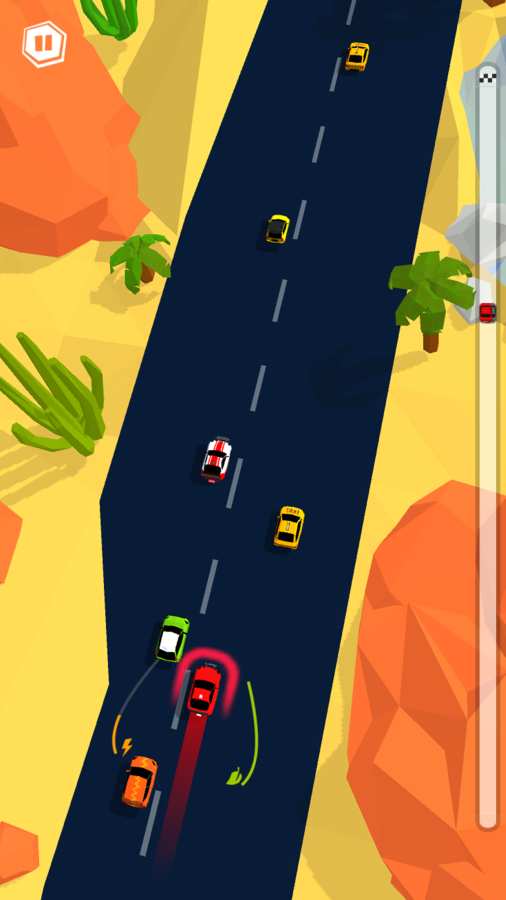 操作轻松简单,图像可爱多彩,有闯关、交战、无限三种多样游戏模式,道路汽车多样,赛车有五种安装技能。