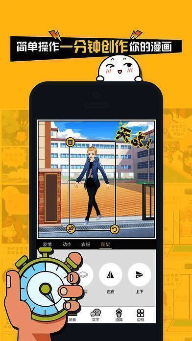 一拖一拉搞定故事人物和场景;超100种特色表情动作自由组合情景;一键分享到微信、微博、QQ空间等社区。