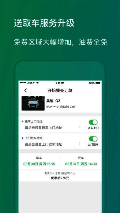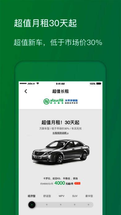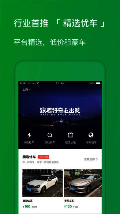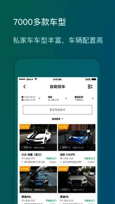 承诺“租贵就赔”,带来惊爆低价;采用场景找车新模式,智能推荐适合各场景的车辆;免费提供取还车服务、洗车及送车上门。