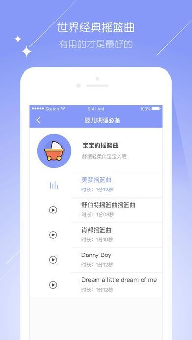 软件选取全球播放量排名前 9 的摇篮曲,既能助宝宝入睡,又能提升宝宝音乐感知能力,既是哄睡神器,也是胎教音乐盒。