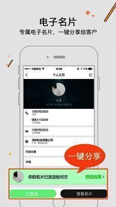 下载安装汇智能通软件后,用户可为自己制作精美名片,并通过网络发给业务往来的客户、公司和朋友。如需更改已发名片信息,在手机上改动后,信息可瞬间更新,让客户第一时间了解最新工作环境和联系方式。