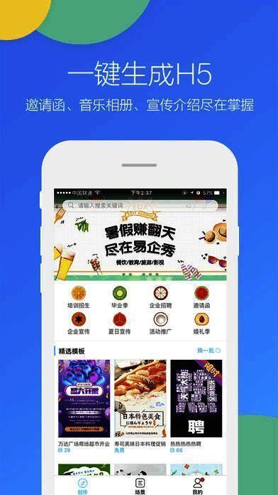 易企秀拥有大量精致原创主题模板,涵盖婚礼请柬、节日贺卡、音乐相册、邀请函、个人简历、企业招聘、公司宣传、产品介绍、促销打折等常见内容,只需替换文字和图片就能生成炫酷H5;
