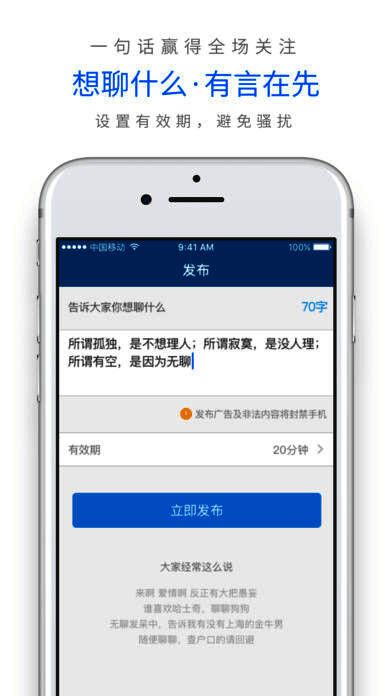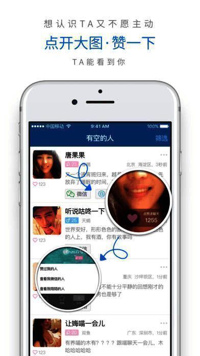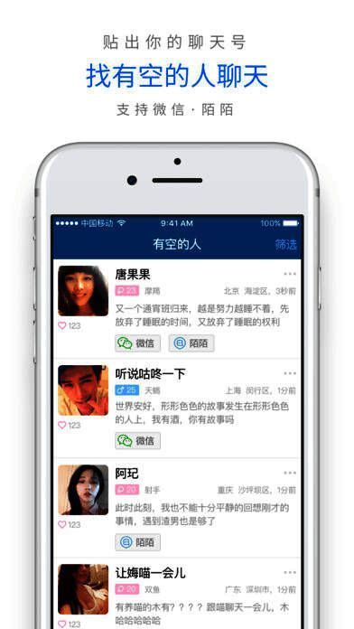 1、在 app 说出想聊话题,等有同感的人加你;2、分享话题,让感兴趣且有空的人找到你;3、不好意思搭讪时,赞一下成为粉丝让对方发现你。