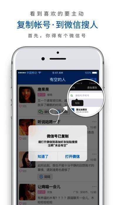有空 app 是社交软件,可看到多平台有空的人并与之聊天,自己有空时还能分享微信等账号等聊。