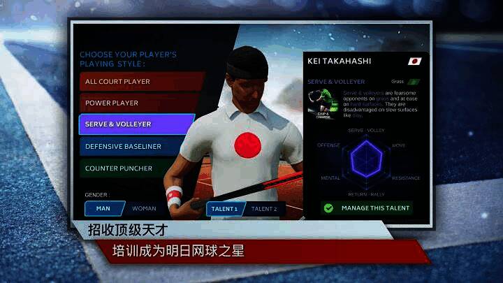 强化球员的比赛风格,包括发球上网、大力扣杀、底线防御、底线反击。