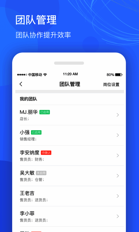 1、该应用支持团队协作,线上即可了解团队成员的职位安排。