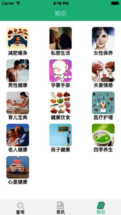 2、能查询健康生活知识,涵盖减肥瘦身、私密生活、女生保养、男性健康、健康饮食、育儿宝典、医疗护理、四季养生、心理健康等方面;